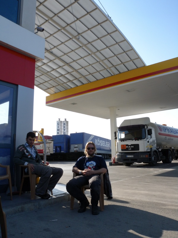 Wir machen uns auf den Weg zu dem erwähnten See, denn es wird bald dunkel. Bald merken wir, daß uns dieser Vorschlag viel Zeit kosten könnte, denn wir bewegen uns in die komplett verkehrte Richtung. Kurz nach dem passieren einer Polizeistreife überlegen wir uns nach dem Weg zu fragen. Wir entscheiden uns gegen die Polizeistreife und für die nahende Shell Tankstelle. Das Bild nach 10min: wir sitzen mit dem Tankwart in seiner funkelnagelneuen Tankstelle und gucken Formel1 Qualifying. Auf Zeitungspapier gebettet auf dem Tisch vor uns: lauter türkische Köstlichkeiten, zig kleine Tellerchen mit Leckereien, Tee, Wasser… was das Herz begehrt.